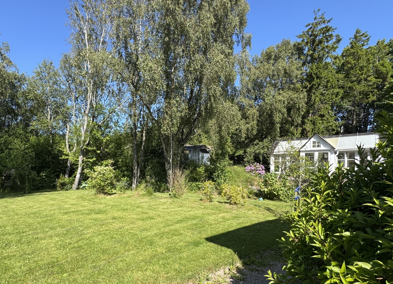Tomten är insynsskyddad av växtlighet och berg. Endast förbipasserande trafik till de 5 fastigheterna längre in på den enskilda vägen passerar på husets framsida.