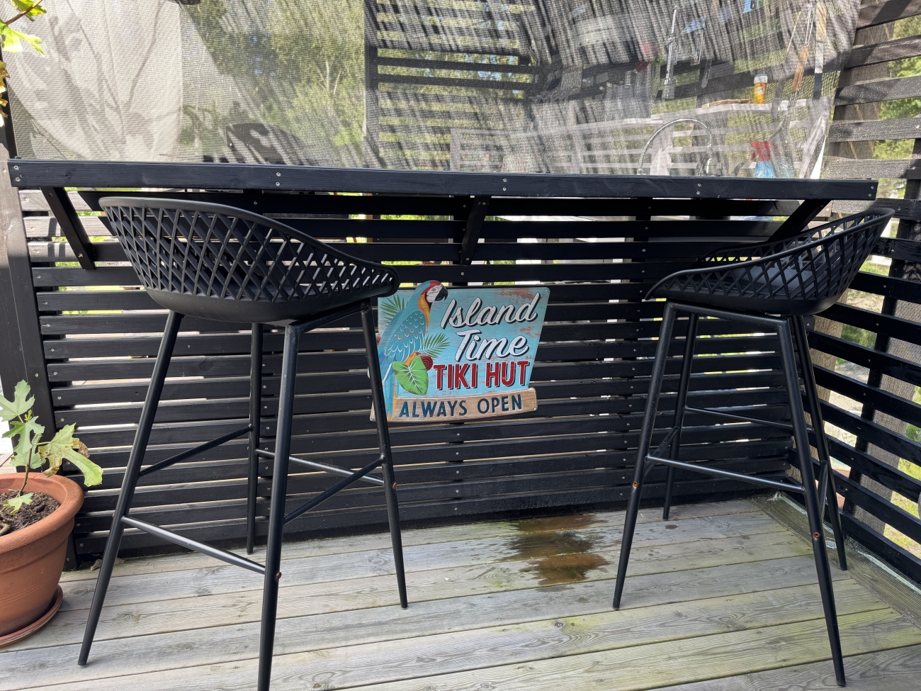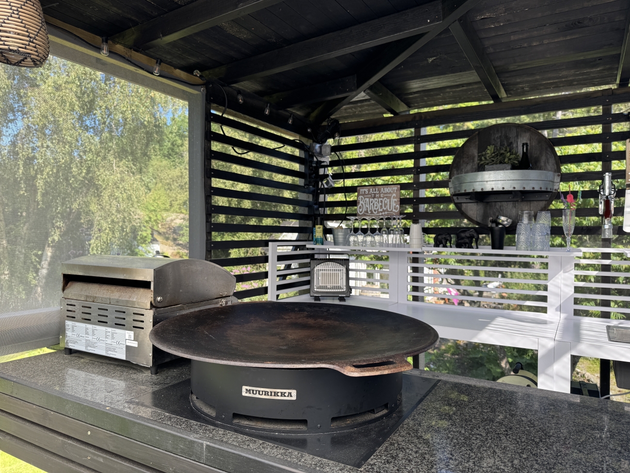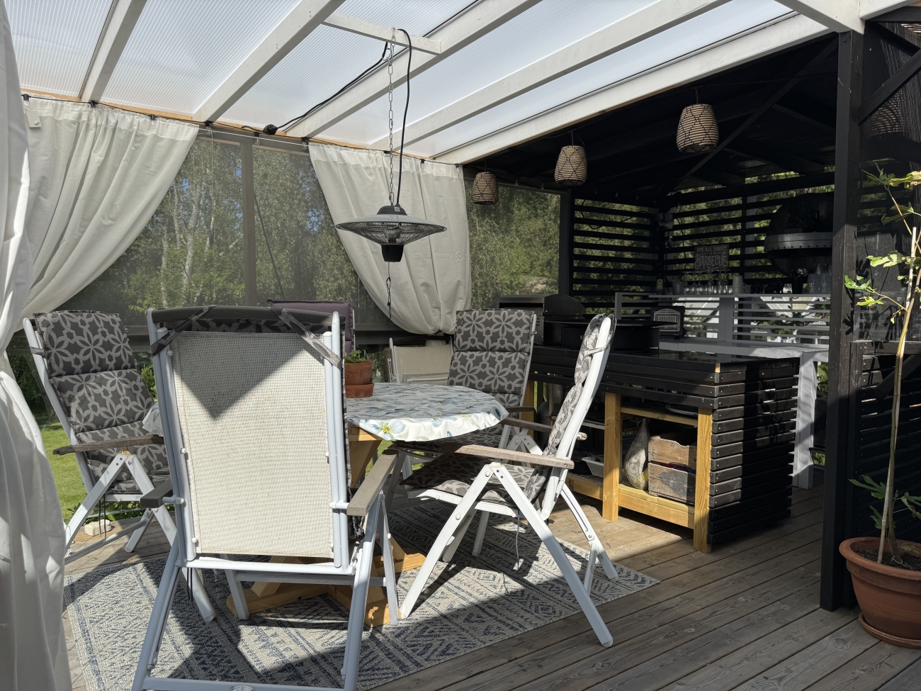 Från vardagsrummets dubbeldörrar tar man sig ut på en stor altan, delvis under tak. Här finns sittplatser för upp till 6 personer samt gasolgrill. Två solsängar, om man väljer att inte gå till stranden.
